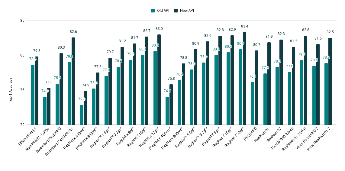 If you are still unconvinced about giving a try to the new API, here is one more reason to do so. We’ve recently refreshed our training recipe and achieved SOTA accuracy from many of our models. The improved weights can easily be accessed via the new API. Here is a quick overview of the model improvements: