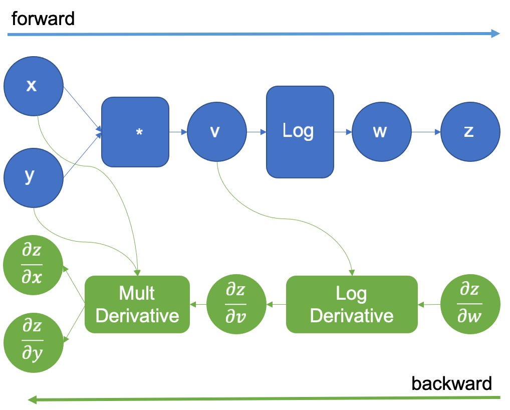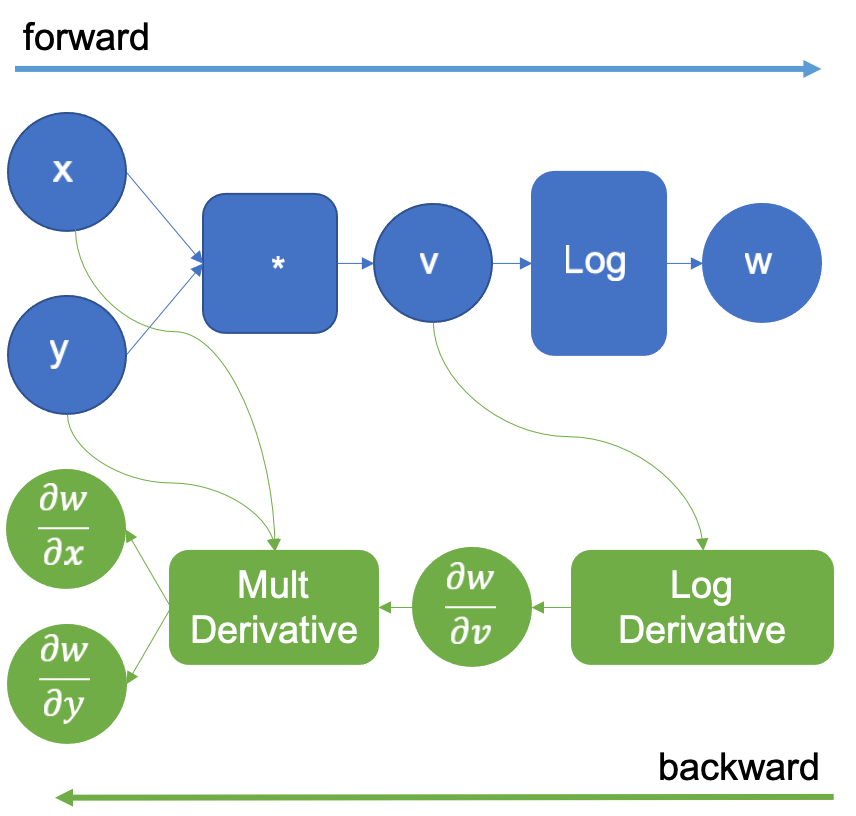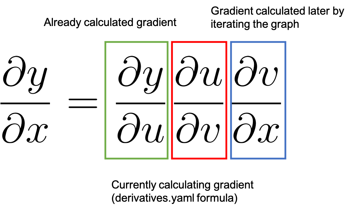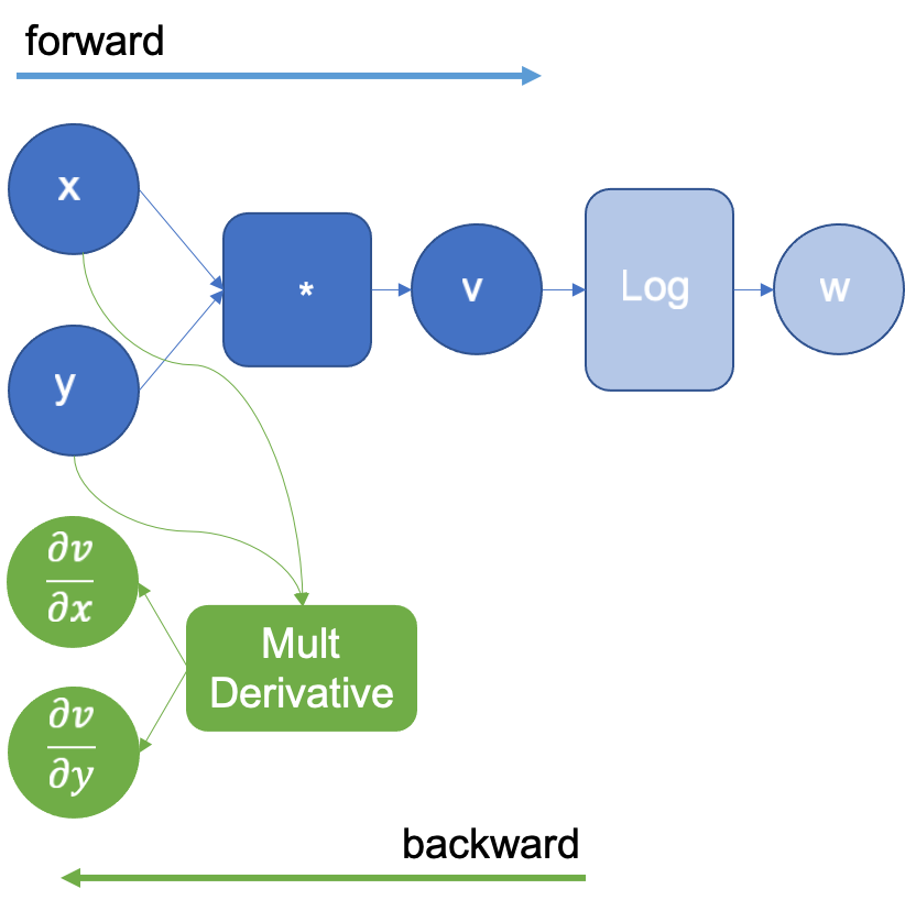 In the example above, when multiplying x and y to obtain v, the engine will extend the graph to calculate the partial derivatives of the multiplication by using the multiplication derivative definition that it already knows. and