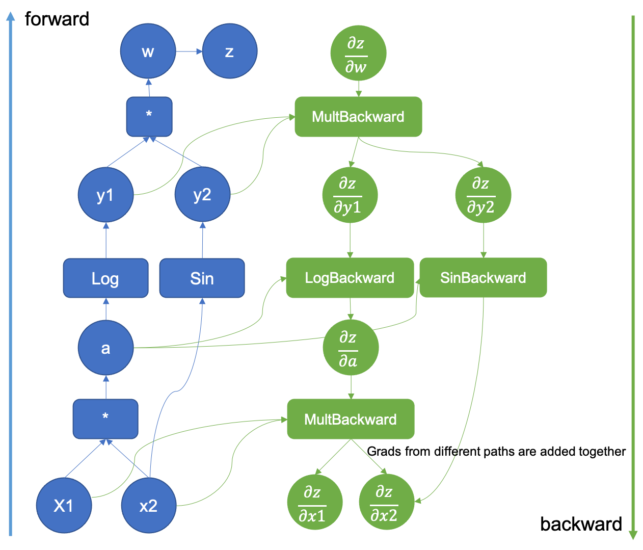 which will be the already calculated gradient (green) when we process the next backward node in the graph.